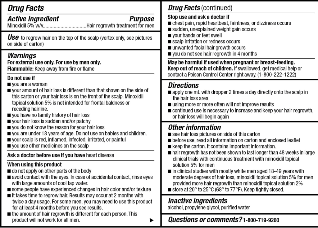 Results may be seen as early as 2 months with twice daily use. For some men, it may take at least 4 months for results to be seen. If you do not see any results after 4 months, stop using minoxidil topical solution 5%.When you first begin to use minoxidil topical solution 5%, your hair loss may increase temporarily for up to 2 weeks. This is likely a sign that you are getting rid of old hairs in order to regrow more new hairs. This temporary increase in hair loss is expected and is a part of the process for how minoxidil topical solution 5% regrows hair. Remember, this increased hair loss is temporary. However, if it continues after two weeks, see your doctor.